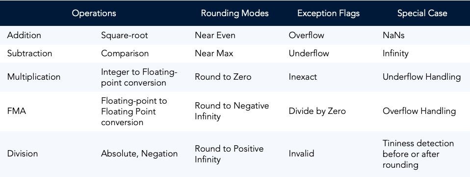 - IEEE 754 debug support for most operations; smart regression flow; intelligent debugger
